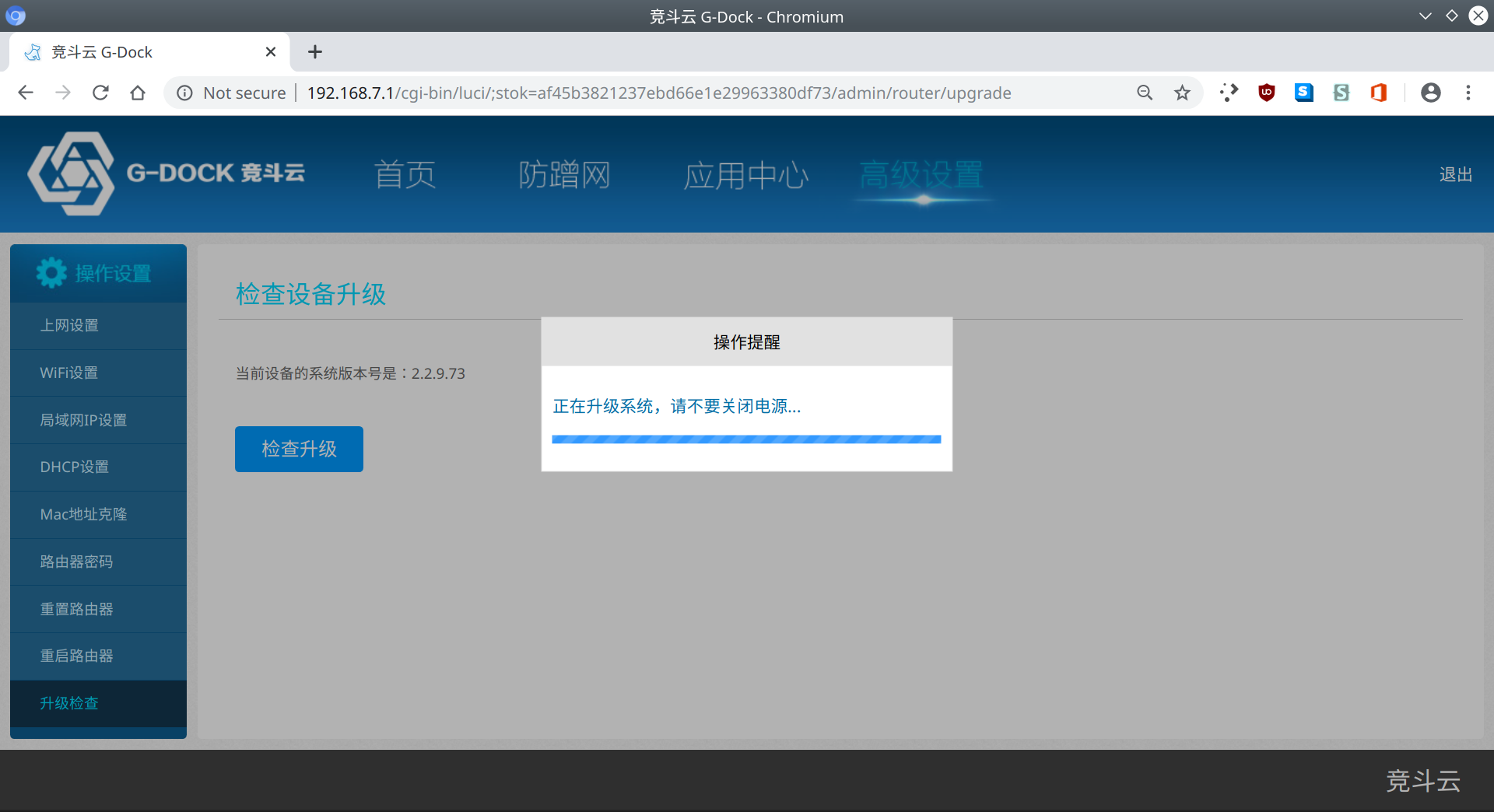8.升级完成后浏览器会重新进入路由器管理界面,重新输入设置过的密码登录即可。此时在主界面点击高级设置→升级检查,这里可以看到在新版官方固件(版本号为 2.5.11.82 )多了上传固件更新系统的功能