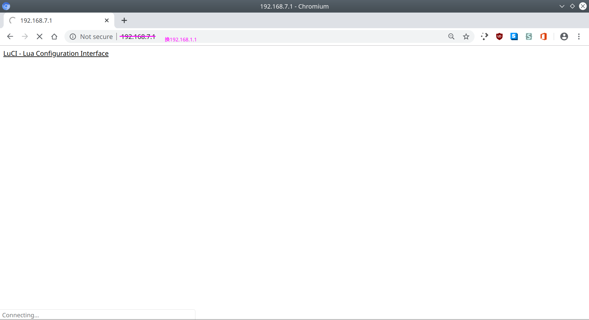 10.刷完固件后,原有的192.168.7.1已经无法访问了,OpenWrt的默认管理地址是192.168.1.1,在浏览器的地址栏输入192.168.1.1即可