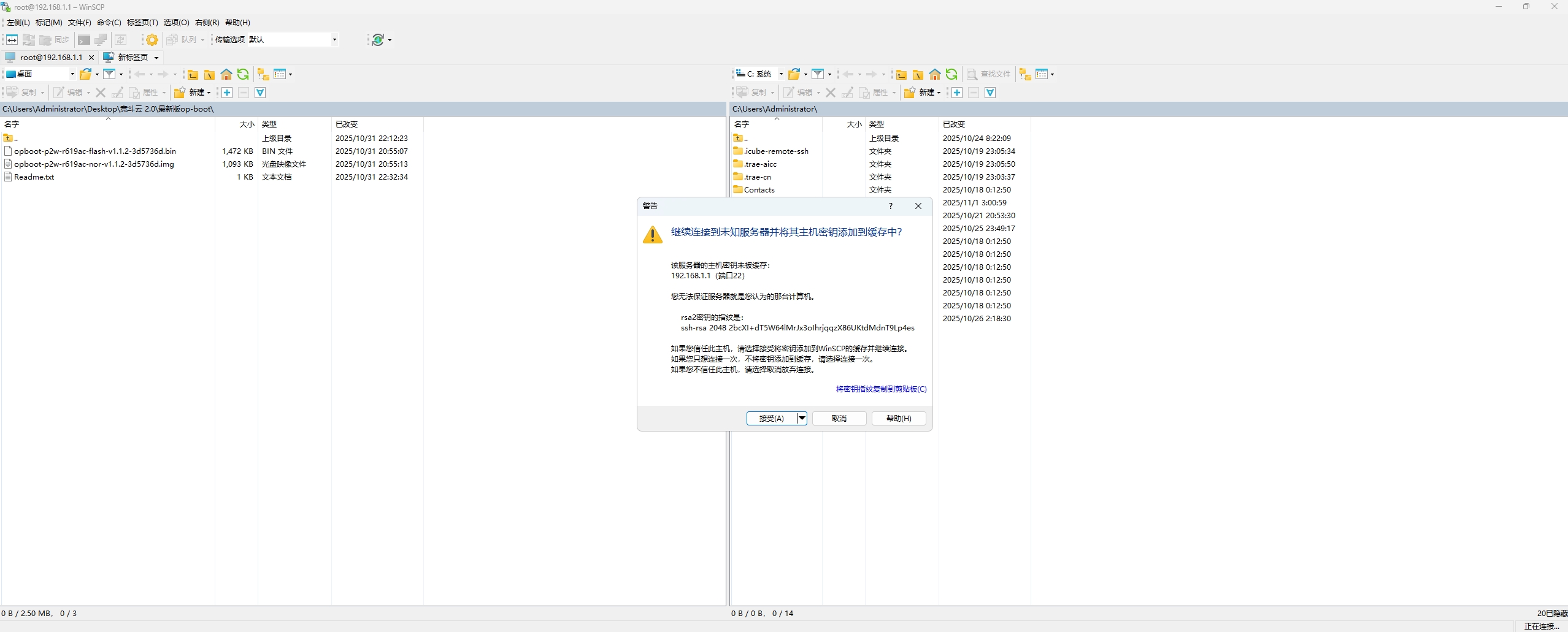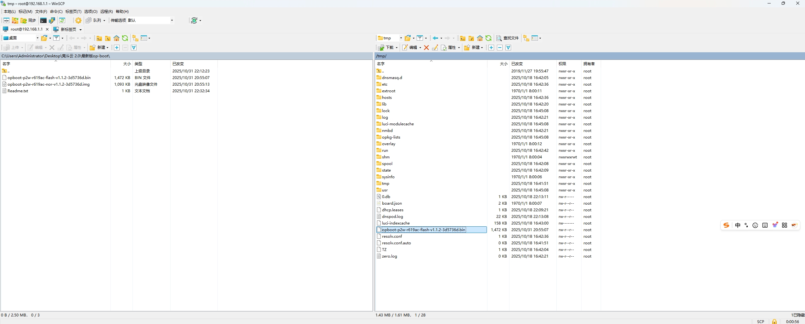 1.WinSCP连接路由器文件库,并上传最新不死后台(即:opboot-p2w-r619ac-flash-v1.1.2-3d5736d.bin)至/tmp路径下