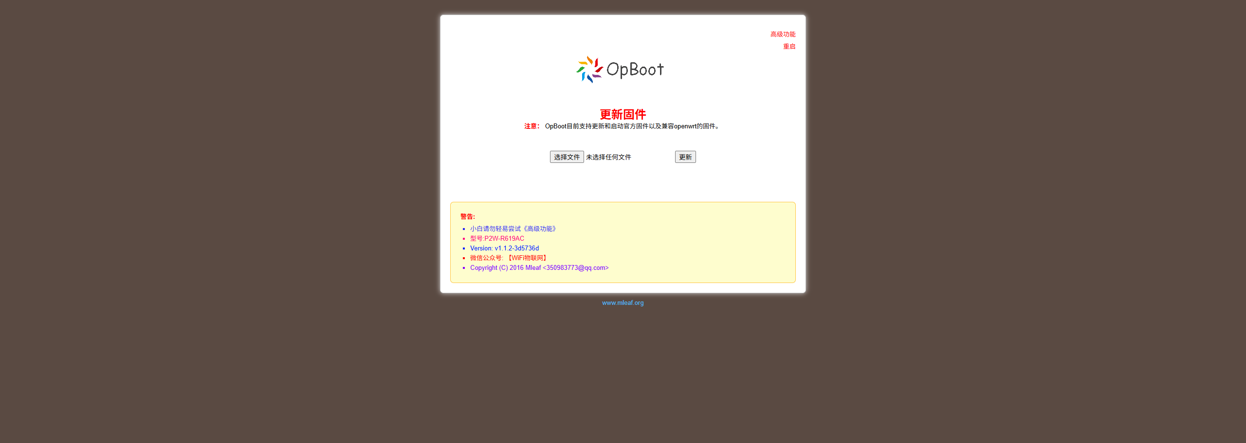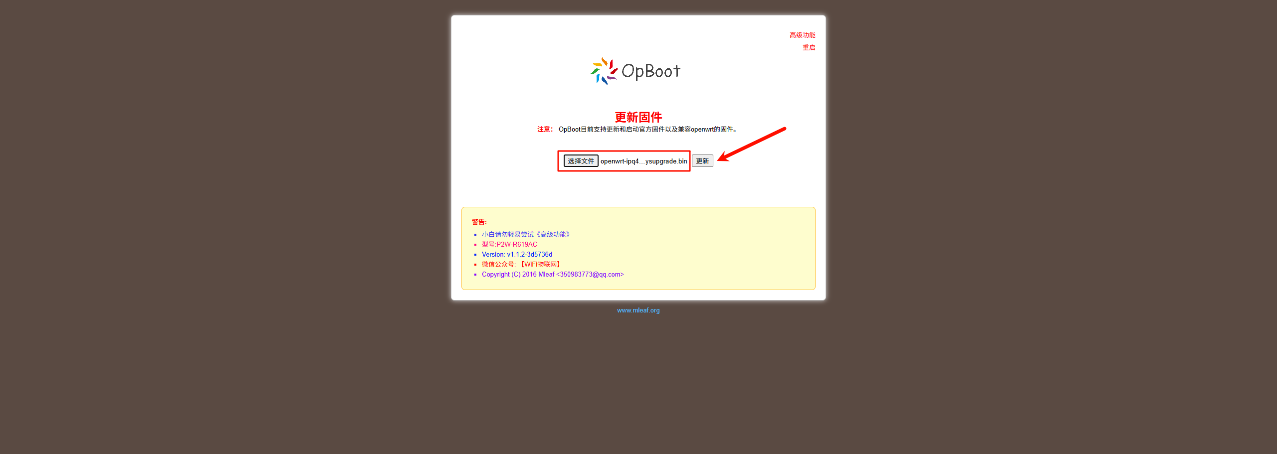 4.点击 返回,进入不死OP-BOOT后台主页面,选择自编译全功能固件(即:openwrt-ipq40xx-generic-p2w_r619ac-128m-squashfs-nand-sysupgrade.bin),进行刷写