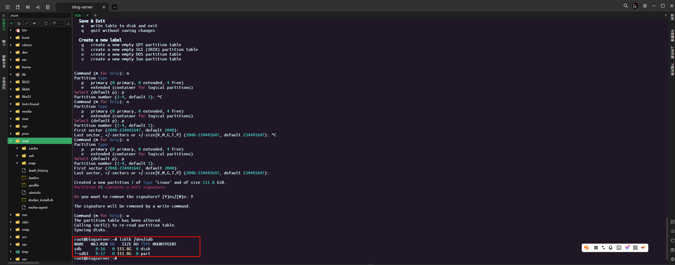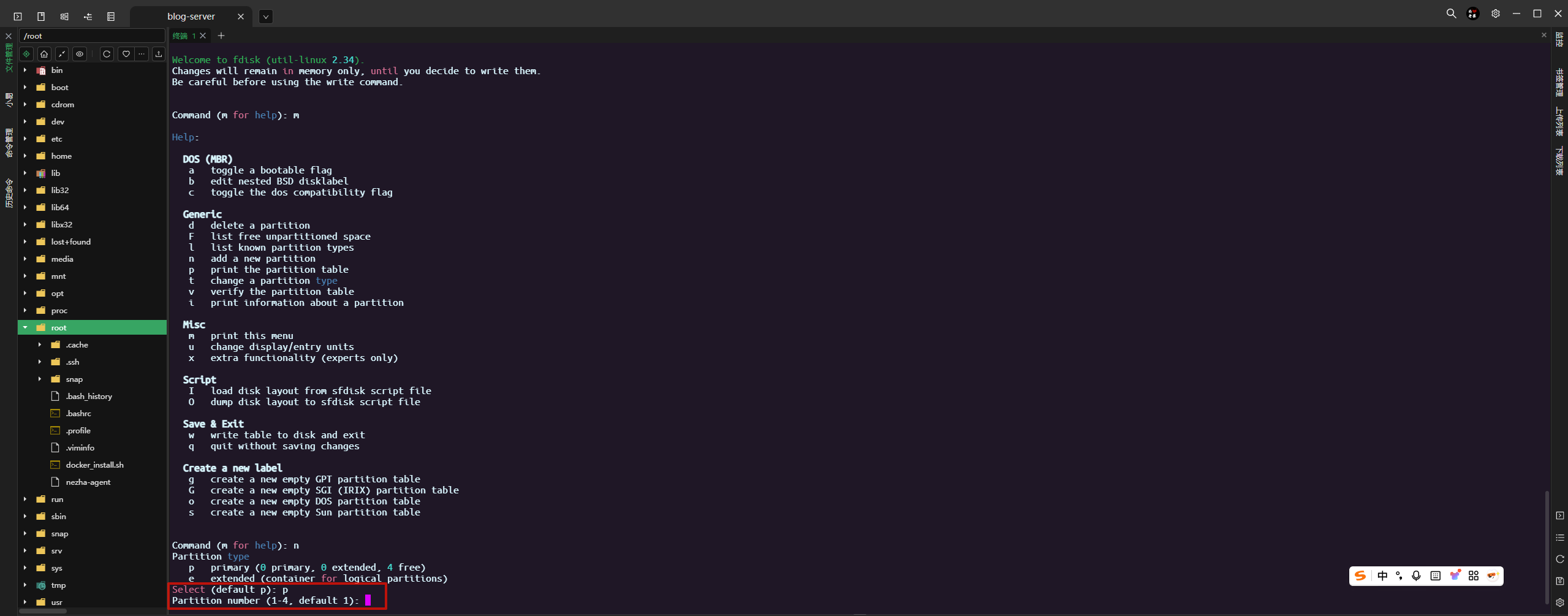 此时新磁盘是没有进行任何分区的,接下来进行分区操作