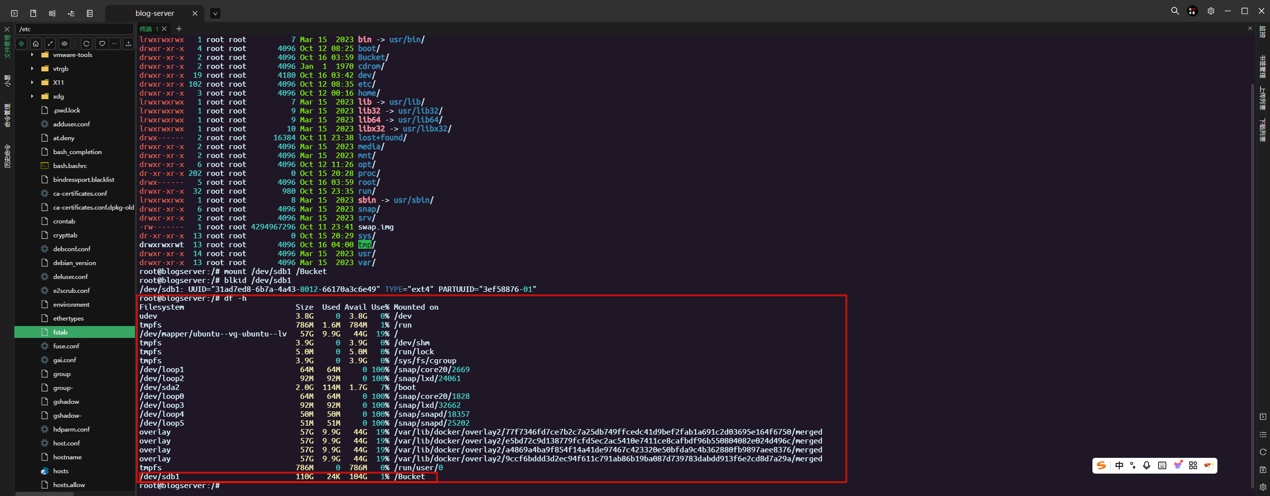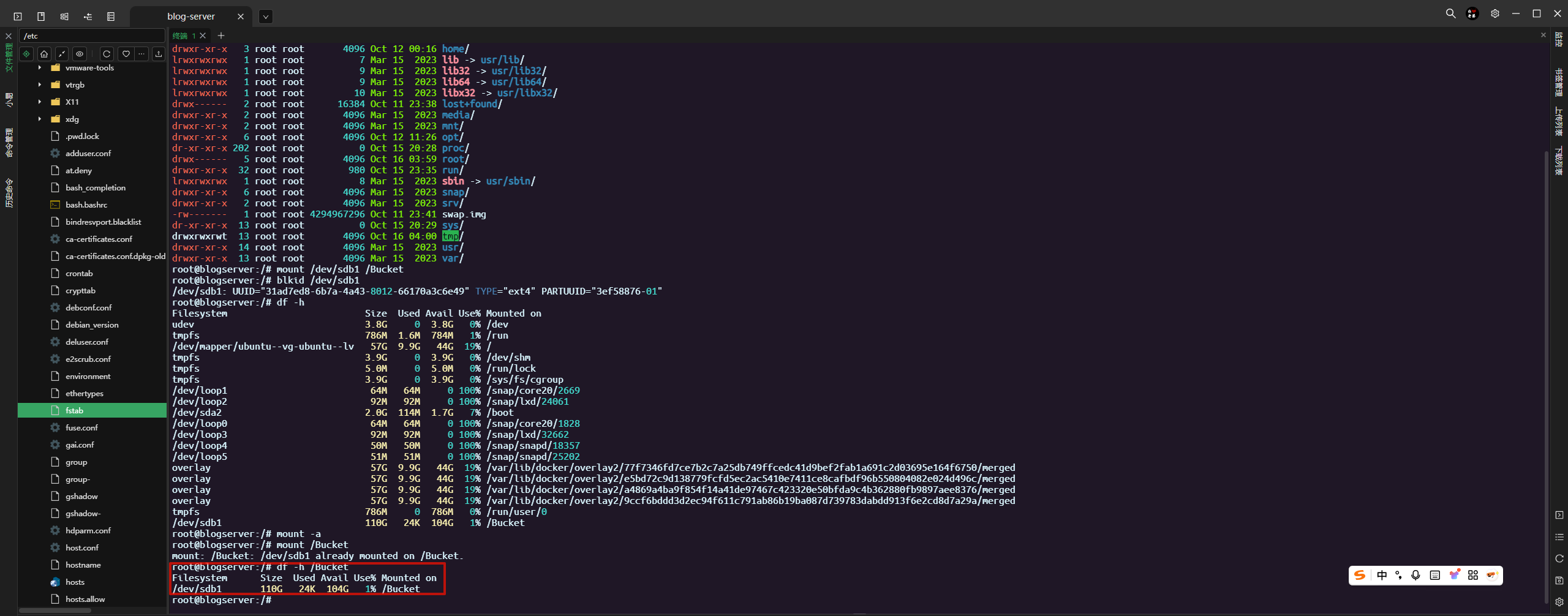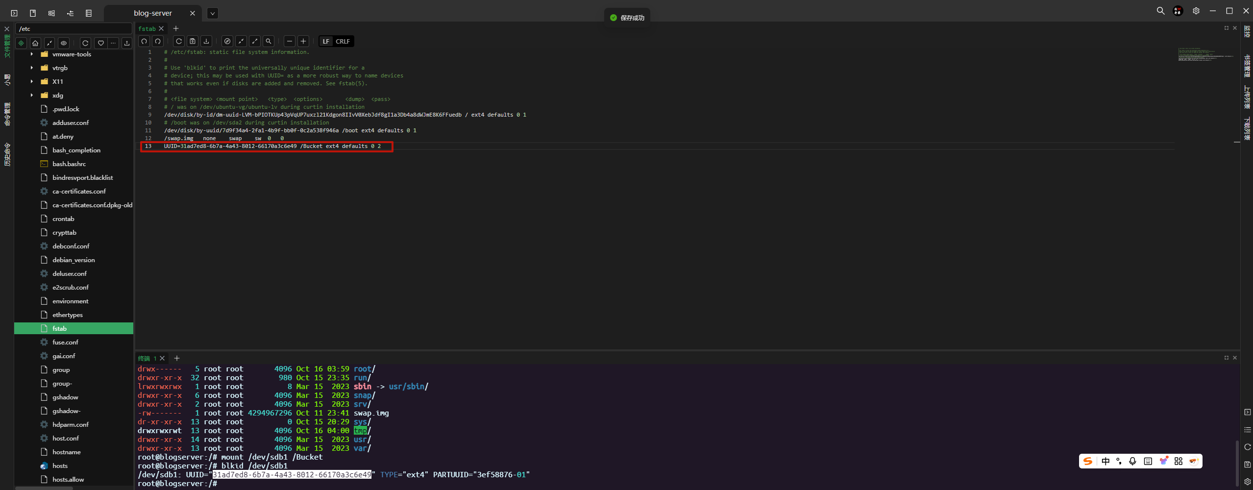 在最后一行,追加写入:UUID=31ad7ed8-6b7a-4a43-8012-66170a3c6e49 /Bucket ext4 defaults 0 2